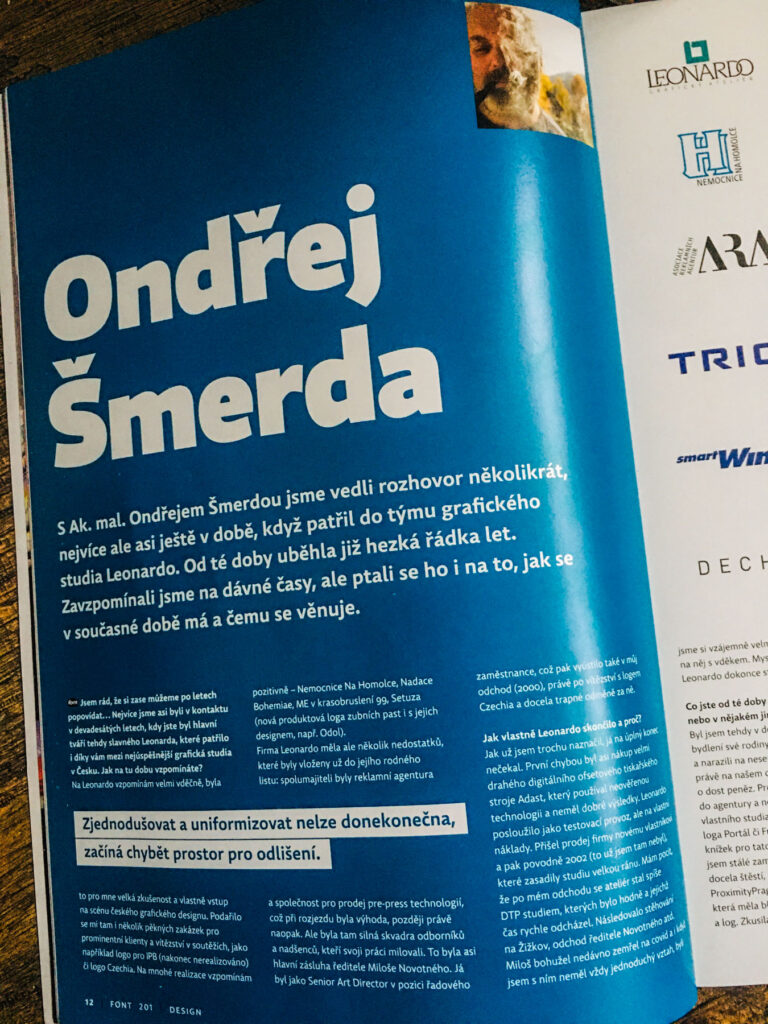 Vzpomínku na starší časy i pohled do dálek budoucích i zahraničních přináší rozhovor s ak. mal. Ondřejem Šmerdou, který patřil do týmu již v 90. letech nejúspěšnějšího grafického studia Leonardo, a který je učitelem i mé dcery na Hollarce.