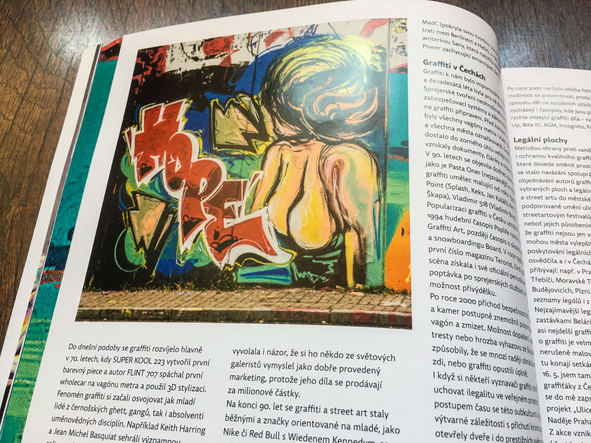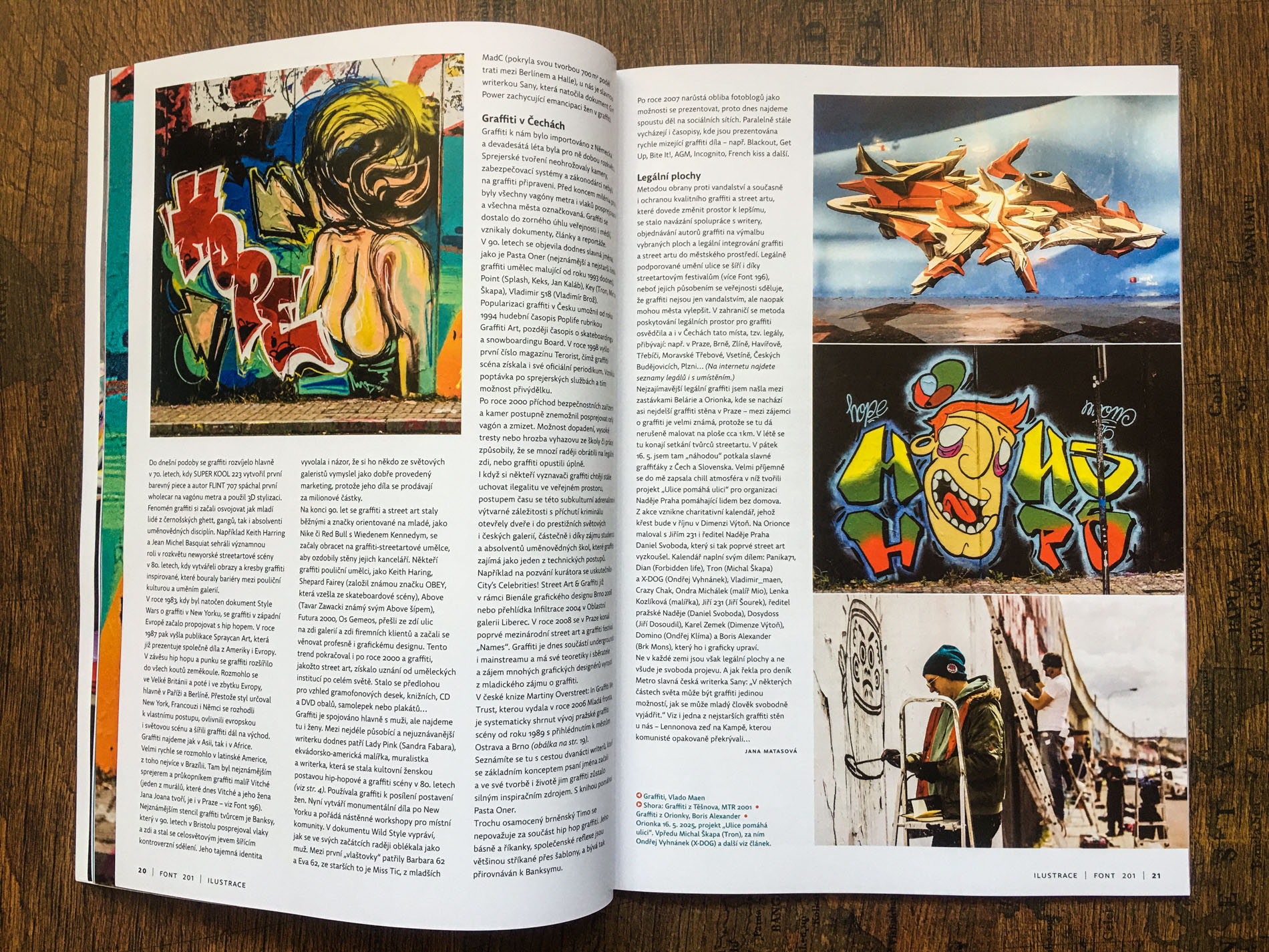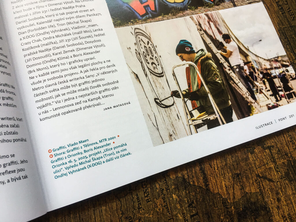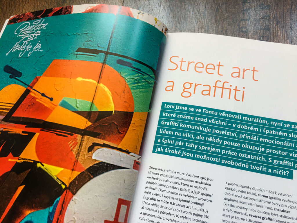 V článku o graffiti pro časopis Font číslo 201 můžete krátce nahlédnout do graffiti filozofie, slangu, členění, jeho původu a historického vývoje současnosti graffiti v Čechách i ve světě. Je druhým článek o street artu. První se zabýval murály (Font číslo 196), které jsou více propracovanou nástěnnou malbou, kterou potkáte na zdech ulic i vnitřních prostor budov.